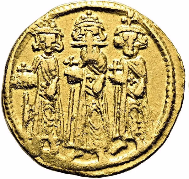 On the obverse, the solidus presents a commanding dynastic tableau: Heraclius, flanked by his heirs Heraclius Constantine and Heraclonas, all crowned and solemnly holding globi crucigeri—the sacred orbs symbolizing Christian dominion over the world. Few Byzantine coins convey imperial continuity and legitimacy with such visual and historical force.